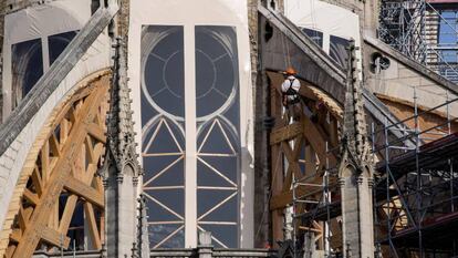 Pese a la ola de calor que azota París estos días, al igual que en buena parte de Europa, las obras continúan en la isla de la Cité, la antigua Lutecia, el corazón de la capital francesa. Las altas temperaturas son una preocupación más a añadir a la larga lista de desvelos que acumula Villeneuve desde el 15 de abril. "Me preocupa mucho, porque la catedral ha sufrido por el fuego, y después por el agua de los bomberos. La mampostería no se ha movido, los sensores no han detectado ningún movimiento. Pero mi angustia es que las juntas de mampostería, a fuerza de secarse, pierdan su cohesión y su calidad estructural y ¡paf! puedan caerse. Tenemos que permanecer muy vigilantes", dice mientras muestra a un reducido grupo de periodistas extranjeros las zonas de obra en el exterior del templo.