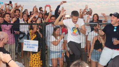 Pucho salió al escenario con una camiseta de los Veranos de la Villa, lo que guste o no ya es un gesto político. Lanzaron tres canciones jóvenes —Deséame suerte, El discurso del rey, Palmeras en la mancha— y antes de empezar la cuarta ya estaban hablando gallego para agradecer al público su presencia. Un concierto adaptado al Náutico, opuesto a la potencia de los grandes estadios donde actúan últimamente y desde hace mucho. Pidieron por favor que no se olvide nadie de las salas, siempre lo hacen, y se acercaron a la parte que el responsable de comunicación del Náutico, Carlos Crespo, llama "la sala VIP", que no es otra cosa que la gente que se agolpa en las vallas que dan a la playa para aunque sea escuchar el concierto.