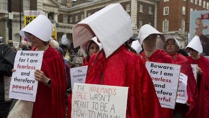 Ya en la primera marcha de las mujeres en Estados Unidos de 2017 había pancartas que pedían que la obra de Margaret Atwood volviera "a ser ficción otra vez", y el clamor, o pavor, sobre la relación entre la actualidad y El cuento de la criada no han cesado. Pero lo cierto es que Atwood, formada en historia norteamericana de los siglos XVII y XVIII, más que hacia adelante, en su libro miró hacia atrás. Una de las reglas que se impuso al escribir la novela fue no incluir nada que no hubiera ocurrido en algún momento o lugar del mundo. Los creadores de la serie de televisión, cuando avanzaron con nuevas temporadas, que iban más allá de la trama de la novela, también debieron aceptar esa misma condición. En El cuento de la criada hay cosas de la historia de la esclavitud, de los juicios de Salem, o del régimen soviético, también del ascenso al poder de los nazis y de cómo la normalidad democrática puede acabar sin más. En la nueva novela, Los testamentos, también hay referencias históricas: desde un brutal centro de detención y fusilamiento ubicado dentro de un estadio de fútbol como ocurrió en Chile, hasta una campaña para recuperar a un menor convertido en héroe nacional, que recuerda a Elián, el niño balsero cubano. "Robar niños, pedir que sean devueltos y sacarles del país donde esté es un tema recurrente en la historia", dice.