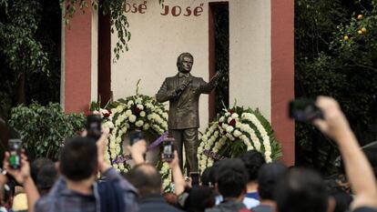 Frente a la escultura se reunía este sábado un grupo de cantantes que aprovechaba para homenajear a José Rómulo Sosa Ortiz, el verdadero nombre del artista, de la mejor forma posible: con su legado musical. "Si me dejas ahora, no seré capaz de sobrevivir", cantaba Norma Juárez, de 58 años, mientras trataba de grabar la melodía con su celular. "¡Era el ruiseñor del romance!", dice sin apartar las manos del aparato. En Clavería, José José escuchaba —a escondidas de su padre, que le exigía escuchar ópera y no música popular, según escribió en su autobiografía Esta es mi vida (2008)— las canciones de José Alfredo Jiménez, otro de los más grandes de la banda sonora al sur del río Bravo.
