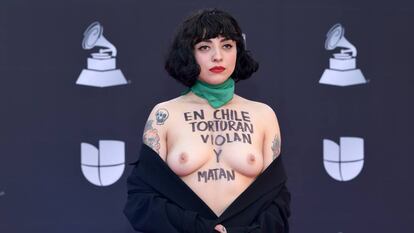 La artista chilena Mon Laferte ha aprovechado la alfombra roja de los Grammy Latinos, que se han celebrado este jueves en Las Vegas, Estados Unidos, para protestar por la violencia que vive su país. Durante las fotos, ante cientos de medios internacionales, se ha abierto el vestido y sobre su pecho ha mostrado un mensaje rotundo: “En Chile torturan, matan y violan”. Y sobre su cuello, un pañuelo verde a favor de la legalización del aborto.