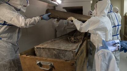El ataúd de plomo, así como la botella, deben abrirse en una próxima etapa, a principios de 2020. “Espero encontrar dentro el esqueleto entero”, dice la arqueóloga antropóloga Hélène Réveillas, responsable de la excavación.