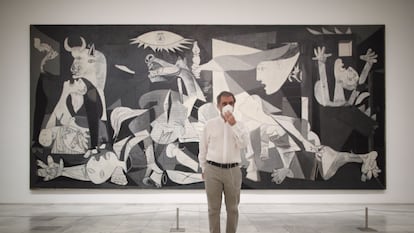 El visitante con mascarilla seguirá las pautas sanitarias que se indican en vinilos pegados en el suelo de los pasillos y las paredes previas a la entrada de las salas. En los interiores de las estancias se ha decidido no incluir señalización, ni regular cada paso de las visitas. No hay rastro de los círculos anaranjados y flechas azules (que recuerdan a las marcas del Camino de Santiago) ante el icono del museo. Solo podrán contemplar Guernica 30 personas a la vez, siempre separadas entre sí y sin límite de tiempo. El peso de la nueva normalidad recaerá sobre la conciencia de cada visitante y las llamadas de atención de los vigilantes.