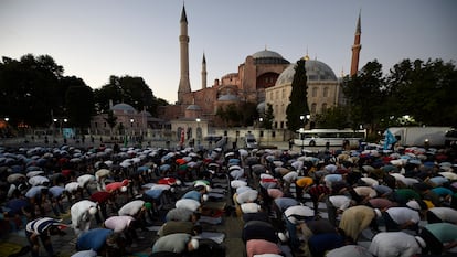 Lo que sí es cierto de la defensa del Gobierno turco de su actuación es que cuenta con amplio consenso interno. Las encuestas señalan que más del 60% de la población aprueba su apertura al culto, aunque también la mayoría de la opinión pública cree que es una maniobra de distracción política. También es verdad que la narrativa en los medios de comunicación —la mayoría controlados de cerca por el Gobierno— ha sido unidireccional. Los académicos e intelectuales ―como el premio Nobel Orhan Pamuk o la escritora Elif Shafak― que han lamentado la medida han tenido que hacerlo a través de las redes sociales, la prensa extranjera o pequeños medios alternativos. Contactado por este diario, Pamuk se remitió a unas declaraciones a la BBC del pasado sábado en las que afirmó: “Millones de turcos seculares como yo lloran contra esta medida, pero sus voces no son escuchadas”.