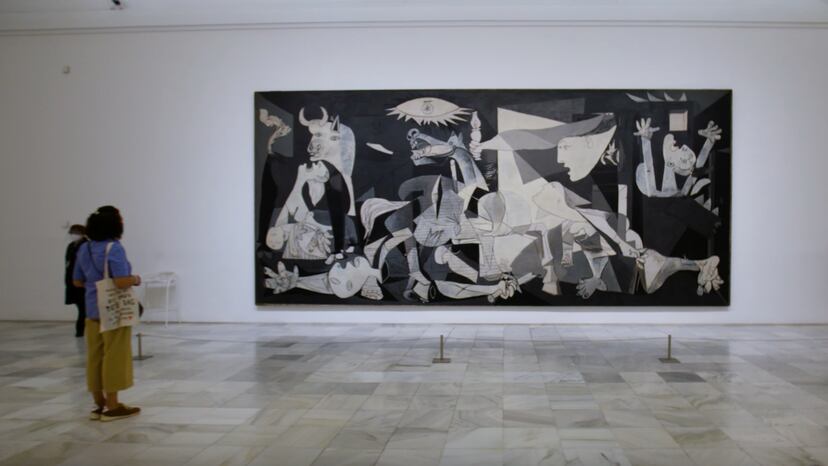 Paloma y Lola han madrugado para disfrutar del Guernica de Pablo Picasso en el Museo Reina Sofía, algo que podría pasar por rutinario, si no fuese porque es la primera vez que lo ven desde el confinamiento provocado por la covid-19. “¡No hay nadie! Tienes el cuadro para ti solo”, exclama emocionada Lola, jubilada. Para su amiga, psicóloga, es como si el lienzo cobrase vida para hablarle al espectador y contarle la tragedia de sus trazos. En la sala que ocupa la obra, con el retorno del museo a la actividad, ahora no pueden coincidir más de 30 espectadores a la vez. Es obligatorio el uso de mascarilla y seguir las líneas que marcan la distancia de seguridad entre los asistentes, que encuentran a su paso dispensadores para lavarse las manos.