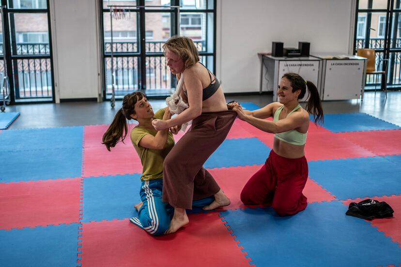Mientras Catalina —hace dos semanas se vio en el Teatro del Barrio de Madrid y del 10 al 12 de diciembre estará en La Caldera de Barcelona—, la compañía prepara La mártir Felicitas en distintas residencias de creación como la que desarrollaron la semana pasada en La Casa Encendida. “Es una reflexión acerca de cómo hoy día siguen siendo refrendadas socialmente prácticas y actitudes martirológicas. Como referencia nos inspiramos en una mártir del siglo II después de Cristo en Cartago, llamada Felicitas”, explica Morales. “Por ejemlo, buscamos la representación del dolor en el flamenco y la música pop de los años ochenta”, apunta Moreau. “Exploramos el mundo del dolor y del placer. Y los límites del martirio causándonos daño de verdad entre nosotras en mismas”, añade Keisanen. En ese proceso dicen haber descubierto que es más difícil y trabajoso ser verduga que mártir.