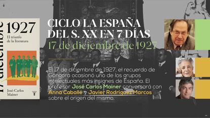 El 17 de diciembre de 1927, un grupo de jóvenes poetas paseaba sus versos y sus resacas por Sevilla, bajo la excusa del tercer centenario de la muerte de Góngora. Formaban parte no tanto de una generación como de una maniobra de afirmación de grupo, pero ahí nace El 27, y cristaliza la llamada Edad de Plata de la cultura española. El profesor José-Carlos Mainer, uno de los mayores expertos sobre esa época, conversa, este miércoles a las seis y media de la tarde, con la escritora Anna Caballé sobre este extraordinario grupo, en un encuentro moderado por el periodista de EL PAÍS Javier Rodríguez Marcos.