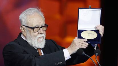 Gonzalo Suárez (Oviedo, 85 años), un cineasta singular, sin parangón en España, recibió la Medalla de Oro de Egeda anoche, gracias a su singular filmografía. Tras recordar a su hermano, el fallecido director de fotografía Carlos Suárez, habló de los productores. "Pensaba que a lo mejor no se iban a acordar de mí, pero siempre me he acordado de ellos", contaba entre risas y bromas. "Respeto muchísimo a los productores, una profesión dificilísima que a veces, porque no había más remedio", dijo más serio, y agradeció a Enrique Cerezo -"el dueño de mis películas"- su labor de conservación del cine español. Y remató su discurso con un "acabados los preámbulos, ya no tengo más que decir, salvo volver a dar las gracias".