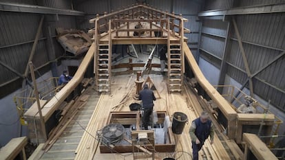 Pero la aventura de la construcción de la Victoria 500 no comenzó en los astilleros de Punta Umbría el pasado febrero, sino en noviembre de 2018 en el Archivo General de Indias de Sevilla, donde se custodian los documentos (43.000 legajos) de las relaciones de España con sus territorios de ultramar. De sus estanterías han salido los datos que el historiador y perito naval Ignacio Fernández Vial ha aportado al ingeniero naval Daniel Santos para el proyecto. De momento, los carpinteros se afanan en la cubierta, un espacio de 200 metros cuadrados en el que los marineros trabajaban y dormían, a la intemperie; porque la bodega, donde se guardaban víveres y mercancías, siempre estaba cerrada. Pero antes de salir de la botella, la nueva Victoria tendrá que darse una capa de brea para que el color acaramelado del iroko se asemeje al marrón oscuro de su vieja antepasada.