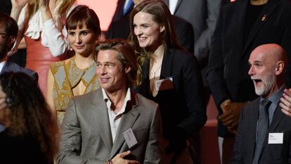 Quizá la estrella más brillante, porque se mezcló con todos los asistentes a la copa antes de la comida, fue Brad Pitt. Nada más entrar, lo abordó un hombre con barba que iba arrastrando un cartel de Érase una vez en… Hollywood. Era Mark Ulano, nominado a la mejor mezcla de sonido por esta película y Oscar en 1998 por Titanic. Ulano estaba aprovechando la comida de los nominados para recoger los autógrafos de todos sus compañeros nominados en la película. Se conocen porque ha trabajado con Pitt tres veces y dos con Leonardo Di Caprio. Ha trabajado con Tarantino desde Abierto hasta el amanecer. “Somos familia”, decía a EL PAÍS.