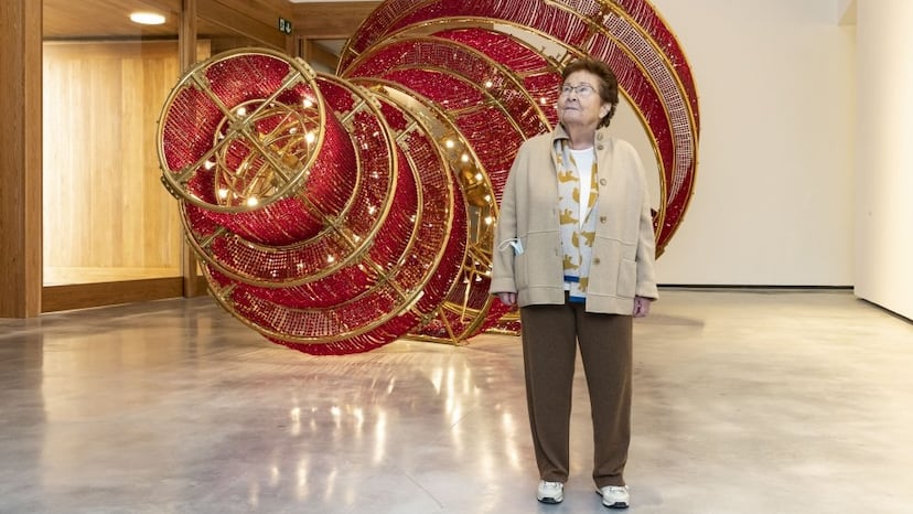 En cada sala del nuevo centro hay varios ejemplos de ese enamoramiento del que habla una mujer a la que la mascarilla no le incordia especialmente: “Nací en 1936, y en Alemania, durante la Segunda Guerra Mundial, íbamos a la escuela con máscaras antigás que te cubrían la cara entera”. En la planta dedicada a la geometría, entre obras de Dan Graham, Imi Knoebel, Günther Förg y Candida Höfer —y no lejos de una pintura monocroma de Alan Charlton que compró hace solo un mes— destaca una sala dedicada a Actividad en eco, un espectacular juego de colores y espejos firmado por Olafur Eliasson. Un piso más abajo, en la planta dedicada a la figura humana, junto a piezas de Louise Bourgeois, Joseph Beuys, Nan Goldin, Stephan Balkenhol, Juan Muñoz o Cindy Sherman, cobran vida propia El viaje que no fue, una película de Pierre Huyghe que se proyecta solitaria en una sala oscura del tamaño de un cine mediano, y una instalación abrumadora de Thomas Hirschhorn, Herramientas de poder: mil objetos desplegados por el suelo y las paredes de una sala de 10 metros de altura que Helga de Alvear atraviesa recordando que la compró a partir de una foto que vio en una revista: “La vi en una información sobre una exposición en el Kunstmuseum de Wolfsburgo y me reconocí. ‘Esto soy yo’, me dije, ‘esta locura’. Y la compré. Es la primera vez que la veo montada”.