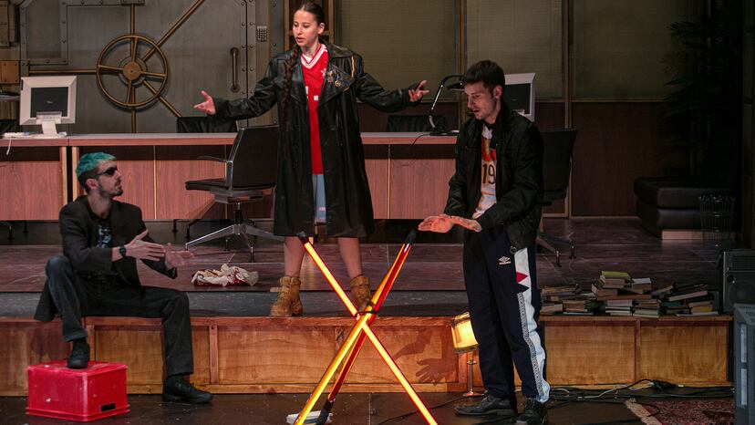 La historia se inicia con el encargo que reciben dos jóvenes dramaturgos de un magnate del teatro, Boris Kacynski, para escribir una obra con el único requisito de que gire en torno a un atraco a un banco. Comienzan los ensayos en una oficina bancaria de estética sesentera en la que, al grito de “Todos al suelo, hijos de puta”, entran dos atracadores, uno con máscara de payaso, otro con traje azul eléctrico. Mientras rehenes y empleados se esconden aterrados, dos de ellos, Nao Albet y Marcel Borrás, se incorporan y miran lo que sucede a su alrededor, sin ser vistos por los atracadores. Son dos realidades paralelas. No les gusta lo que ven. “Basura”, “no me lo creo”, “a la mierda, esto es una mierda”. Entonces los dramaturgos deciden enviar el texto a la gran María Kapranov (Irene Escolar), una artista de la performance, representante del teatro más rompedor y radical, que les anima a abandonar los preceptos del Kacynski Theatre.