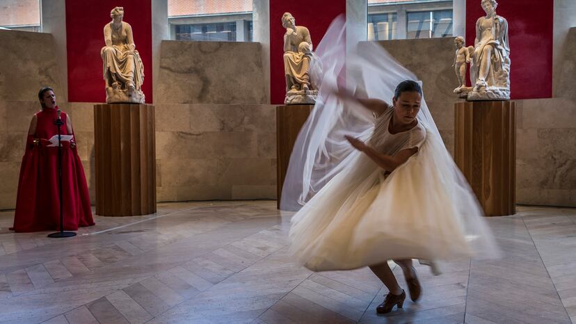 El zapateado vanguardista de Rocío Molina tronó esta mañana en la Sala de las Musas del Museo del Prado. Rodeada de ocho esculturas romanas que representan a las divinidades protectoras de las artes y las ciencias, Molina ha bailado para los visitantes de la pinacoteca madrileña una pieza única e irrepetible, concebida expresamente para ese espacio. La acompañaban la soprano Olalla Alemán y el artista sonoro Derek Van Den Bulcke. Con esta sorprendente mezcla de flamenco, danza contemporánea, música barroca y electrónica experimental, la bailaora malagueña ha demostrado, una vez más, su capacidad para romper las costuras de cualquier disciplina.