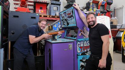 La consola primigenia se conoce como arcade, voz de origen francés referida a los soportales donde se plantaban estas máquinas que Iriarte y sus compañeros coleccionan, reparan y exhiben en la antigua fábrica de Juguetes Rico, Ibi (Alicante). Al espacio de este museo se suma una nave industrial de unos 400 metros cuadrados, localizada en el municipio murciano de La Unión, donde los técnicos de la entidad se esmeran en recomponer y abrillantar medio centenar de piezas, procedentes de todos los rincones de Europa y Estados Unidos. Han costado entre 300 y 3.000 euros, sufragados con cuotas de la asociación. Algunas estarán listas en dos meses, otras tardarán años en restaurarse por falta de recambios. Litarte señala una consola serigrafiada con motivos flamígeros: “Es el primer videojuego cooperativo de la historia”. Se refiere a Fire Truck (1978), que emula en blanco y negro la conducción de un camión y su remolque.