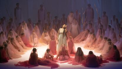Don Giovanni y Leporello, que visten trajes blancos impolutos, son virtualmente indistinguibles, casi un calco el uno del otro. Donna Elvira aparece al principio y al final con un niño pequeño, presuntamente el hijo que ha tenido con el seductor y que este, por supuesto, rehúye. Don Ottavio, una suerte de niño grande, aparece caracterizado de las guisas más diversas y menos favorecedoras (militar de uniforme y banda, explorador noruego, héroe de la Antigua Grecia, rey con su corona, o de blanco níveo tocado por un penacho y una capa de armiño), casi como si no perteneciera a este mundo ni a esta época, al menos no a los de Don Giovanni. Donna Anna, Zerlina y Masetto salen mejor parados de la quema, la primera como una heroína trágica, severa, inalcanzable, una mujer sufriente en la mejor tradición griega. La pareja de campesinos encarnan a esa servidumbre sometida a los caprichos de sus amos, con Zerlina como un lujurioso –y accesible– objeto de deseo. Ante la propuesta de Castellucci caben básicamente dos opciones: dejarse entretener por su ocasional potencia visual (que va claramente de más a menos) o intentar encontrar algún sentido o explicación a su inagotable sucesión de ocurrencias. Esta última parece, sin embargo, una alternativa abocada al fracaso. Don Giovanni necesita contarse y explicarse, pero el italiano renuncia a ambas cosas, encerrando la creación de Mozart y Da Ponte en un constructo mental que tan solo él, sus colaboradores y, quizá, algunos visionarios acertarán a comprender.