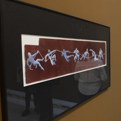 Antes de la inauguración de la exposición, el jueves 23, Nazario dio un paseo por las amplias salas del monasterio con este periódico para hilar un relato entrelazado con su propia vida, en obras en las que aparecen él, Alejandro ―su pareja durante 36 años—, los novios de ambos, el artista y performer Ocaña y hasta el guitarrista Diego del Gastor, con quien Nazario aprendió a tocar en Morón de la Frontera, su primer destino como maestro de escuela. “Si van a venir niños a ver la exposición, que firmen antes que no se van a escandalizar con nada”, advierte el dibujante, conocido por sus explícitas escenas homoeróticas y sus críticas a la Iglesia católica, por las que tuvo problemas con la censura durante la dictadura.