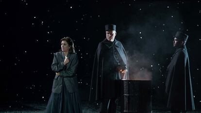 La producción de Richard Jones ha vuelto a exhibir sus virtudes, más que sus genialidades: un espacio pequeño para retratar la buhardilla y hacer creíble la intimidad entre Rodolfo y Mimì en la segunda mitad del primer acto y la posterior muerte de ella, arropada por sus amigos, al final del cuarto; un comedor del Café Momus también muy reducido para concentrar mejor el ir y venir de frases de todos los comensales, que se contrapone en el segundo acto a esas galerías de tiendas comprimidas en una falsa perspectiva; y una casucha diminuta en el tercero que hace las veces del cabaret prescrito en el libreto y que, junto a un barril a modo de brasero, parece una minucia en medio del gran escenario vacío del Teatro Real, sobre el que cae incesantemente la nieve, como al final del primer acto. La lucha contra el frío de unos personajes ateridos es, de hecho, una constante a lo largo de toda la ópera. Los cambios de escenografía se realizan a la vista del público mientras los técnicos desplazan unos decorados para dar paso a otros. La visibilidad de decorados antiguos y futuros conviviendo con los presentes nos aleja, por tanto, de la realidad y deja al descubierto el artificio, siempre muy bien iluminado, pero la música nos sumerge indefectiblemente en ella. Jones lo sabe y fía, como debe ser, la credibilidad a la partitura de Puccini. Nada que ver con aquella legendaria producción de Franco Zeffirelli que inauguró la temporada del Teatro alla Scala en 1963 y que sirvió de vara de medir para muchas de las posteriores. También Jones parece aquí amigo de las “piccole cose”.