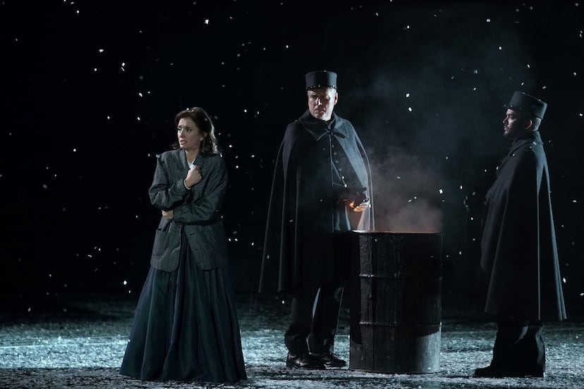 La producción de Richard Jones ha vuelto a exhibir sus virtudes, más que sus genialidades: un espacio pequeño para retratar la buhardilla y hacer creíble la intimidad entre Rodolfo y Mimì en la segunda mitad del primer acto y la posterior muerte de ella, arropada por sus amigos, al final del cuarto; un comedor del Café Momus también muy reducido para concentrar mejor el ir y venir de frases de todos los comensales, que se contrapone en el segundo acto a esas galerías de tiendas comprimidas en una falsa perspectiva; y una casucha diminuta en el tercero que hace las veces del cabaret prescrito en el libreto y que, junto a un barril a modo de brasero, parece una minucia en medio del gran escenario vacío del Teatro Real, sobre el que cae incesantemente la nieve, como al final del primer acto. La lucha contra el frío de unos personajes ateridos es, de hecho, una constante a lo largo de toda la ópera. Los cambios de escenografía se realizan a la vista del público mientras los técnicos desplazan unos decorados para dar paso a otros. La visibilidad de decorados antiguos y futuros conviviendo con los presentes nos aleja, por tanto, de la realidad y deja al descubierto el artificio, siempre muy bien iluminado, pero la música nos sumerge indefectiblemente en ella. Jones lo sabe y fía, como debe ser, la credibilidad a la partitura de Puccini. Nada que ver con aquella legendaria producción de Franco Zeffirelli que inauguró la temporada del Teatro alla Scala en 1963 y que sirvió de vara de medir para muchas de las posteriores. También Jones parece aquí amigo de las “piccole cose”.