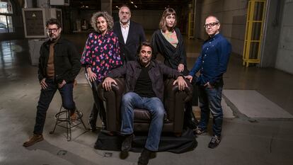 Javier Bardem se sienta en un sofá, rodeado de cinco de sus compañeros actores candidatos al Goya y, tras dejar claro que asume esa posición porque el fotógrafo así lo ha requerido, se le escapan inmediatamente dos chistes: “Parecemos Succession [la serie de HBO]”, y una gloriosa imitación de Julio Blanco, su personaje en El buen patrón. Que en su caso más que imitación es reencarnación, porque Bardem aspira a su sexto Goya como actor (posee además otro como productor del documental Hijos de las nubes) gracias a su interpretación del dueño de Básculas Blanco, un empresario que debe poner orden en su vida y en su negocio en la semana que aspira a un premio que ansía por encima de todo. La sátira que ha escrito y dirigido Fernando León ha logrado 20 candidaturas a los premios Goya, un récord en los galardones del cine español, y ocho de sus actores —otro hito— compiten en las categorías de interpretación. Y por eso Bardem posaba este jueves en las antiguas rotativas de EL PAÍS rodeado de cinco de sus compañeros candidatos: Sonia Almarcha (encarna a Adela, la esposa de Blanco); Fernando Albizu (Román, el vigilante jurado); Óscar de la Fuente (Jose, el despedido que acampa frente a la empresa); Manolo Solo (Miralles, trabajador en caída libre sentimental), y Almudena Amor (Liliana, una becaria con innumerables secretos en la manga). En la sesión faltan Celso Bugallo (Fortuna, el viejo empleado), en su casa con gripe, y Tarik Rmili (Khaled, el encargado en ascenso), en Marruecos con su siguiente proyecto.