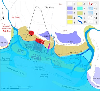 “La aparición, además, de piritas framboidales (mineral típico de cuerpos de agua muy deteriorados o muy pobres en oxígeno) en los sedimentos podría indicar un caso de contaminación temprana del área lagunar. Esta, tal vez, estaría relacionada con la acumulación de residuos orgánicos provenientes de la producción intensiva de múltiples factorías de salazón de pescado (principal actividad industrial de la ciudad)”. Sea como fuere, dentro de la ciudad, las calles trazadas norte-sur (cardos) canalizaron el retroceso del tsunami, facilitando su reflujo. Por el contrario, la gran avenida este-oeste (decumanus) y estructuras murarias anexas “actuaron como trampa para sedimentos”.