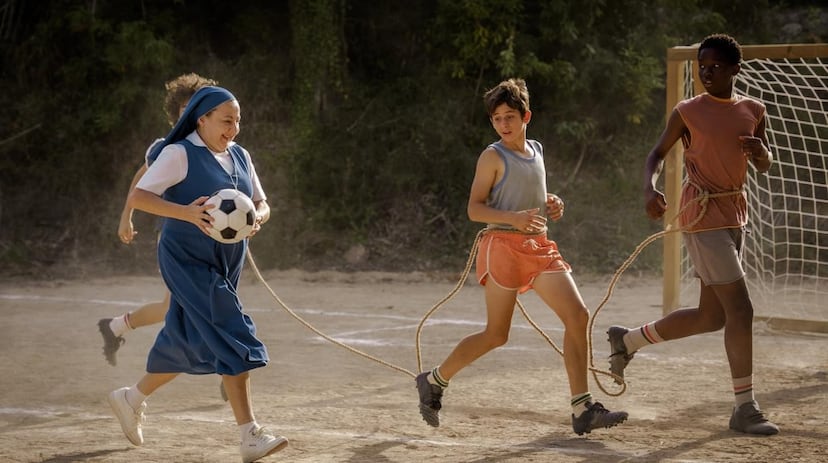 Bueso, también coguionista, parece tener como referente la actitud y la complicidad de la pandilla de la maravillosa Cuenta conmigo (1986), aunque en un ambiente muy distinto, y alrededor del fútbol y de un internado de monjas alejado del cliché: hermanas que ríen (no todas, claro, también las hay rectas y ariscas), que se toman una cerveza y se fuman un cigarro en sus descansos. Casi como homenaje, uno de ellos, el desternillante Adrián López, el gordito (“¡cómo que el gordito, cabrón, a que te meto una hostia con la mano abierta!”), lleva el mismo modelo de gafas que River Phoenix en Exploradores. No es el único guiño: desde la redacción de El club de los cinco hasta el detalle de acompañar musicalmente un momento deportivo con Faith, de George Michael, canción que inmediatamente retrotrae a varias generaciones a Cerca de las estrellas, el mítico primer programa sobre la NBA en la tele española.