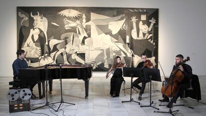 Gernika tiene tantos significados que cuando le preguntan a Aitor Etxebarria (Gernika, 37 años) que cómo es pregunta: “¿A qué te refieres? ¿Al cuadro, al pueblo o al hecho?”. El compositor ha creado una obra sinfónica que conmemora el 85º aniversario del bombardeo que sigue ejemplificando el horror de la guerra. La presenta este jueves, en el Auditorio del Palacio Euskalduna de Bilbao, pero días antes ha acudido al Museo Reina Sofía para interpretar una adaptación, que ofrece en exclusiva EL PAÍS, frente al cuadro de Picasso que ha llevado el nombre de su pueblo por todo el mundo.