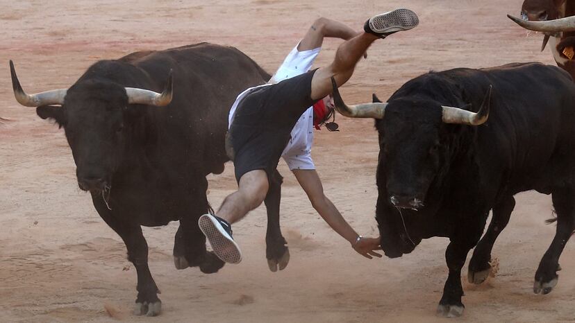 Así, pasada la sorpresa inicial —ese estampido que produce el cohete que señala el inicio de la carrera—, y que el cabestro más voluminoso y veterano aprovecha para liderar los primeros metros de la Cuesta de Santo Domingo, los toros titulares, que entonces corrían unidos y resguardados entre los mansos, pisaron el acelerador y uno de ellos se puso en cabeza a una velocidad endemoniada.