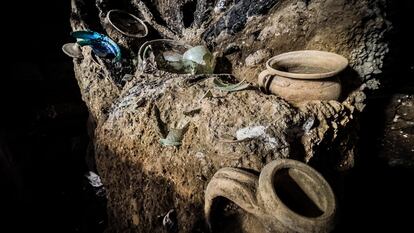 En las otras salas, dos de ellas situadas en el piso superior y a las que se accede a través de un entresuelo, los expertos han encontrado gran variedad de objetos, algunos de materiales preciosos como el bronce y el vidrio, otros de uso cotidiano. Y también muebles de madera “extremadamente sencillos” de los que han podido hacer calcos. “No conocemos a los habitantes de la casa, pero seguramente la cultura de la ociosidad que inspiró la maravillosa decoración del patio fue más un futuro soñado que una realidad vivida por ellos”, ha revelado Zuchtriegel.