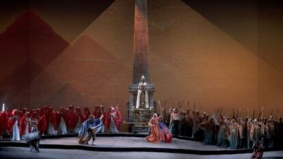 El director de escena ya adaptó esta producción en 2018 y el objetivo del Teatro Real es que se convierta en una producción de repertorio que pueda ofrecer cada pocas temporadas. En esta ocasión, encabezan el reparto la soprano Krassimira Stoyanova, el tenor Piotr Beczala y el barítono Carlos Álvarez. “Que esta producción se haga en el siglo XXI es mi sueño infantil”, ha confesado Beczala tras ver en el escenario ya desplegada la gran pirámide. “Cuando veía de niño este tipo de obras, soñaba con ser cantante”.