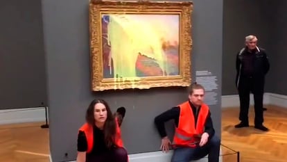 Dos activistas del grupo alemán de protesta por la protección del clima Última Generación han atacado este domingo un cuadro del pintor impresionista francés Claude Monet, lanzando una sustancia viscosa y amarillenta contra él en el Museo Barberini de Potsdam, al suroeste de Berlín. El propio grupo ha reconocido y publicitado la acción en redes sociales, donde ha asegurado que se trata de puré de patata. El cuadro, perteneciente a la serie Les Meules (Los almiares) de Monet (1889-1891) no ha sufrido ningún daño, según un primer análisis de conservación, ha asegurado a EL PAÍS una portavoz del museo. Estaba protegido por un cristal.