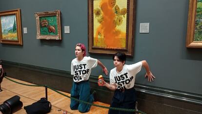 Los principales museos europeos y españoles se han visto obligados a ser más celosos de su seguridad y la vigilancia de sus visitantes para evitar nuevos ataques a sus obras de arte, como ha sucedido en las últimas tres semanas en distintos centros de varios países, protagonizados por la organización ecologista Just Stop Oil. En España se ha activado esa alerta sobre todo desde que el Ministerio de Cultura envió, el martes 25, una comunicación a las principales instituciones estatales instándoles “a extremar las medidas de seguridad y ser exhaustivos” en el cumplimiento de las normas de acceso. El departamento que dirige Miquel Iceta pidió que se prohíba la introducción de bebidas, mochilas, bultos, paraguas y objetos punzantes. En Francia, su homóloga, Rima Abdul Malak, ha urgido a los museos nacionales a “que redoblen su vigilancia” después de que se haya sabido que se evitó una acción similar de una mujer en el Museo de Orsay el jueves. Como reconoce a EL PAÍS una fuente de uno de los principales museos del país, “este asunto es endiablado porque se está sometiendo a una tensión extra a los trabajadores y a los visitantes”. El grupo Just Stop Oil es contrario a que el Gobierno británico conceda nuevas licencias de explotaciones petrolíferas o gasísticas.