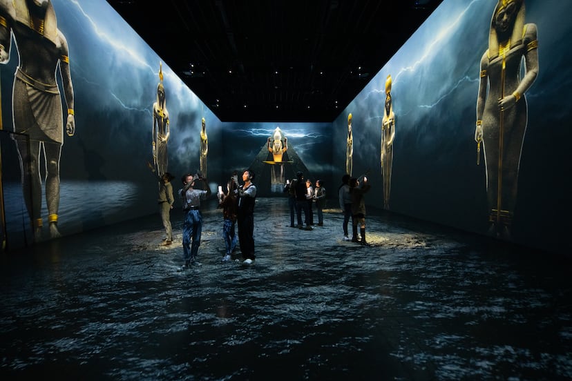 Sin poder mostrar las obras originales, estas exposiciones empezaron su apuesta con reproducciones de los cuadros en tamaño gigante en cajas de luz y con proyecciones en 3D sobre paredes y suelo, con música o un relato de fondo. Esto es el micromapping, el sistema que iba directamente ligado a la etiqueta de exposición inmersiva. En Tutankamón, la exposición inmersiva, en el espacio MAD. Madrid Artes Digitales, en El Matadero, la apuesta se redobla en una sala de proyecciones de 1.200 metros cuadrados en la que durante unos 20 minutos el faraón cuenta su historia, mientras las imágenes se suceden, los escarabajos pasan por debajo de los pies, la música y la luz envuelven.