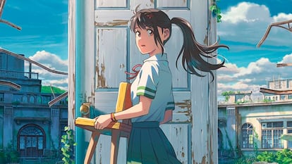 Con Suzume —que se estrena en España el 14 de abril— , Shinkai llega a su séptimo largometraje. El tiempo contigo (2019) no dejó tan buen sabor de boca como este último, otro de sus viajes fantásticos arrebatados con adolescentes protagonistas. En este caso, es la chica de 16 años cuyo nombre da título al filme y que vive con su tía desde el terrible terremoto y tsunami del 11 de marzo de 2011 que provocó 16.000 muertos y la crisis de la central nuclear de Fukushima. En la actualidad, cruza sus pasos con un veinteañero, Sota, que le pregunta por unas ruinas. Le sigue a escondidas y descubre que se dedica a cerrar puertas mágicas por las que asoman unos gusanos gigantescos de fuego, plasmación animada de lo que serían las ondas sísmicas. Desde hace generaciones, la familia de Sota lucha por impedir terremotos y prevenir desastres. Una maldición hace que el chaval acabe encerrado en una silla infantil de tres patas, el único recuerdo físico que le queda a Suzume de su madre, y la pareja viaja por las islas japonesas en una carrera desaforada contra un gato que abre esos portales cósmicos.