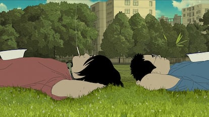 Por desgracia, las conversaciones que deberían ser el motor narrativo lastran por cansancio y devienen en el freno de una trama a la que faltan sacudidas. La animación hereda aquella misma línea clara fascinante de Have A Nice Day, pero todo lo sorprendente que explotaba en aquel thriller se ha convertido en monotonía y planos plúmbeos, en chicos que hablan sin hacer nada en Art College 1994.