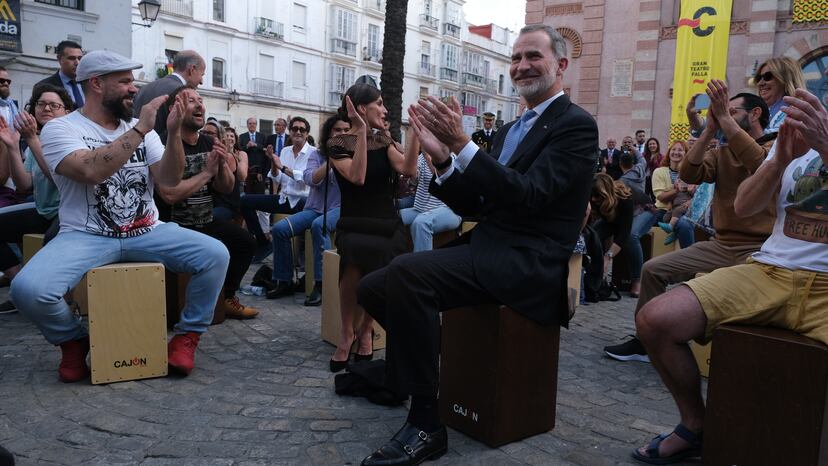 Este espectáculo callejero, mestizo y divertido ha sido el preámbulo al espectáculo de flamenco que se ha vivido en el interior del Teatro Falla, en un concierto titulado Tiempo de Luz. Lo han protagonizado tres referentes del flamenco como Carmen Linares, Marina Heredia y Arcángel. Los tres han estado acompañados por Ana Morales (premio Nacional de Danza de 2022), las guitarras de Miguel Ángel Cortés y José Quevedo, Bolita, y la percusión de Pakito González. Entre el público, además de los Reyes, estaban académicos, asistentes al CILE y autoridades, como el defensor del Pueblo, Ángel Gabilondo; el ministro de Exteriores, José Manuel Albares; el director del Instituto Cervantes, Luis García Montero, y el alcalde de Cádiz, José María González, Kichi. Lo que menos podían esperar es que, de eos presentes, iba a ser el rey Felipe el que más destreza tendría con el cajón al ritmo de una rumba catalana.