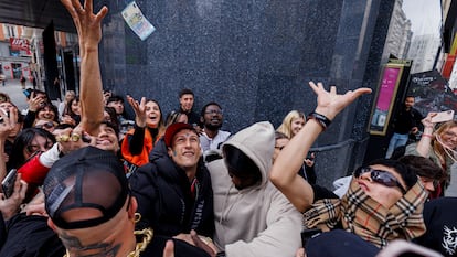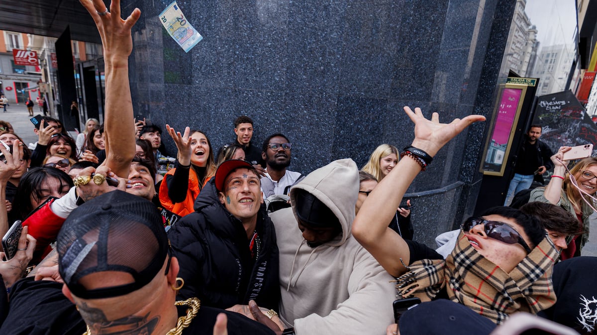 El músico Yung Beef desata la locura lanzando billetes en la madrileña plaza de Callao
