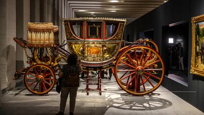 La exposición, titulada En movimiento. Vehículos y carruajes de Patrimonio Nacional, con medio centenar de piezas, podrá verse hasta junio de 2024 y es un paseo en orden cronológico organizado en tres galerías, con entradas desde la central a las laterales, lo que a veces dificulta seguir ese hilo temporal. “Es una colección poco conocida, con obras muy suntuosas, decoradas con elementos como el pan de oro y que formaban parte del protocolo”, ha señalado Rodríguez.