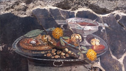 Pompeya no deja de sorprender. Dos milenios después de la erupción del Vesubio que la redujo a cenizas, la máquina del tiempo en la que se ha convertido la vieja ciudad arrasada sigue funcionando a pleno rendimiento. Este yacimiento arqueológico a orillas del golfo de Nápoles continúa siendo una impresionante ventana a la cotidianidad de los antiguos romanos. Los arqueólogos que excavan en una nueva área de la ciudad arrasada por el volcán en el 79 d. C. han descubierto un fresco que representa una naturaleza muerta en la que aparece un plato muy similar a la pizza tal y como la conocemos.