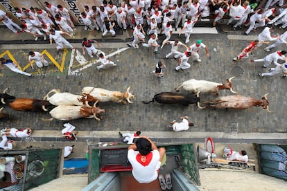 Eloy Alonso (EFE)Los toros a su paso por la curva de la calle Mercaderes.