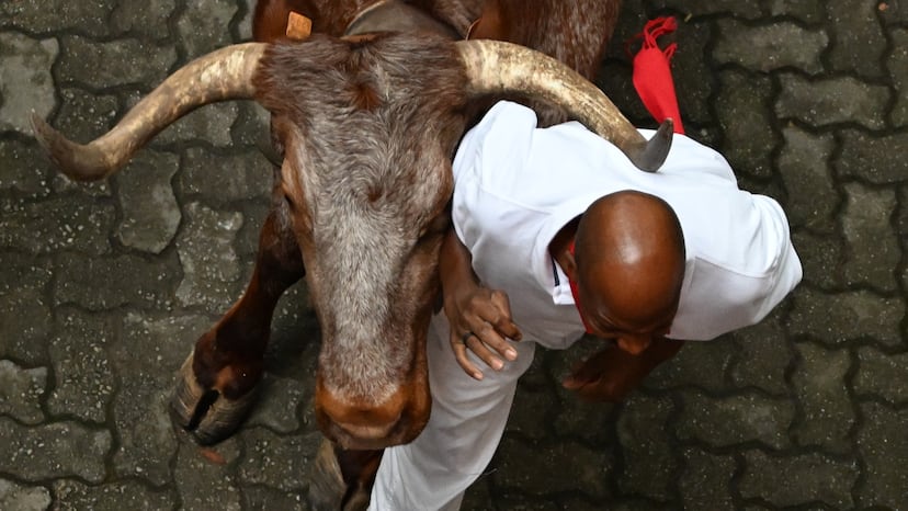 Con los cabestros en cabeza llegó la manada a los tablones de la curva donde comienza la larga calle de Estafeta, abarrotada de corredores. No hubo topetazo contra las maderas y los animales tomaron aire para enfilar esa recta de 304 metros, en la que se abrieron paso con dificultades entre los muchos participantes humanos que se atrevían a sentir la respiración de los toros en la nuca.
