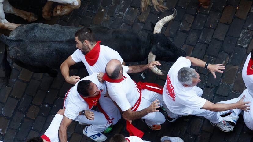 Ahí, en este punto fatídico, se produjeron, como cada mañana, momentos de tensión promovidos por corredores apostados en esa zona prohibida sin posibilidad de escape ante el empuje de los toros que enfilan la calle a toda velocidad.