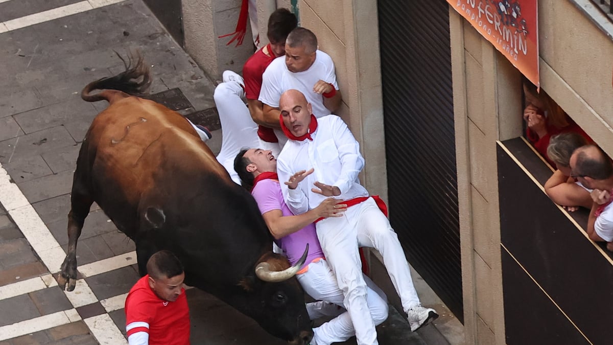 Hasta allí, llegaron hasta cinco cabestros en la cabeza de carrera, donde fueron alcanzados por un toro castaño, y todos los demás, casi en fila de uno, burlaron el temido costalazo contra los anchos tablones de la curva de Mercaderes, donde el corredor de la camiseta roja pasó un momento que, con seguridad, será inolvidable para el protagonista.