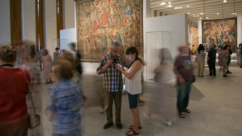 Las crónicas que se han escrito sobre la Galería ya avisaban del tamaño imponente que se abre en el interior del edificio, pero, aun estando prevenidos, los ocho metros de altura que separan suelos y techos no dejan de impresionar. Tras salvar varias rampas descendentes, comienza el recorrido histórico y cultural por las colecciones de arte y objetos decorativos amasadas durante siglos por los reyes de España que abarca desde Isabel y Fernando el Católico hasta la actualidad. En la entrada de la planta dedicada a la dinastía de los Austrias, Juan y Sandrine, español y francesa que pasan las vacaciones en Madrid, solo han tenido tiempo de juzgar los vídeos explicativos que preceden la visita, en los que, piensa Juan, se presenta a la monarquía bajo una luz demasiado “benévola”. “Yo soy profesor de arte, así que visitamos todos los museos que podemos”, explica el español. “Además, ahora en verano tampoco se puede pasear mucho por la calle”.
