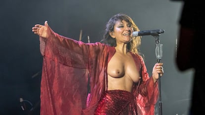 Eva Amaral estaba en penumbra en el centro del escenario principal del Sonorama Ribera. Había más de 35.000 personas congregadas en el recinto. No entraba ni un alfiler. Entonces, cuando el concierto llevaba más de hora y media y había sonado todo un reguero de clásicos del grupo, la cantante empezó a recordar la importancia de “la dignidad” de la “desnudez” femenina. Enumeró unos cuantos nombres de compañeras cantantes que han tenido problemas por mostrar los pechos en un concierto o no han dudado en reivindicar la igualdad de derechos. La gente estaba expectante y, entonces, un inmenso haz de luz mostró a Eva, que, con los pechos desnudos, cogió un megáfono y empezó a cantar Revolución.