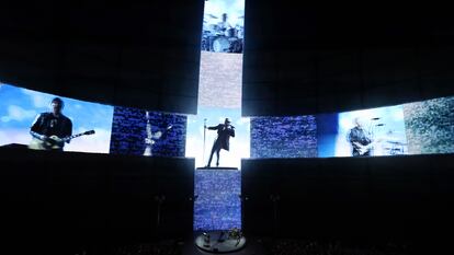 La banda de pop más grande del mundo luce diminuta dentro de la Esfera. U2 volvía el pasado viernes a los escenarios después de cuatro años para inaugurar con una residencia de varios conciertos este nuevo edificio icónico de Las Vegas cuyo principal reclamo es una esfera recubierta de una pantalla led de 54.000 metros cuadrados. Dentro del espacio hay una prisión. Al menos eso parece cuando se mira desde abajo. Allá en lo muy alto hay un hueco, como el techo del Panteón romano. Es una ilusión, pues este es un sitio cerrado. La música comienza a sonar, es Zoo Station, y los muros comienzan a quebrarse. Entra luz del exterior. Blanca y brillante. Forma una enorme cruz. Ha comenzado la misa de Bono, The Edge y Adam Clayton.