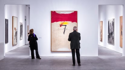 Antes de comenzar una obra, Antoni Tàpies (Barcelona, 1923-2012) seguía un mismo ritual. Con el soporte extendido en el suelo, el artista giraba lentamente de manera circular en ambos sentidos. Cuando se detenía, era la señal de que ya tenía clara la composición y de que había llegado el momento de alisar las tablas o tensar cartones, jugar con el polvo de mármol, preparar colores o clasificar materiales. El material escogido dependía de la etapa de las diferentes etapas de una carrera que se prolongó durante casi 70 años y durante la que realizó alrededor de 9.000 piezas. Ahora, cuando se acaba de cumplir el centenario de su nacimiento (el pasado 13 de diciembre), el Reina Sofía inaugura Antoni Tàpies. La práctica del arte, la muestra más completa que se le ha dedicado hasta el momento, con 220 obras procedentes de museos y colecciones privadas de todo el mundo, realizadas entre 1943 y 2012. Comisariada por Manuel Borja-Villel, permanecerá abierta desde el 21 de febrero hasta el 24 de junio. Después viajará a la Fundació Antoni Tàpies de Barcelona y allí se exhibirá desde el 19 de julio hasta el 12 de enero de 2025. Esta exposición tuvo una “precuela” el pasado otoño en el Palacio de Bellas Artes de Bruselas (Bozar) con unas 120 pinturas.