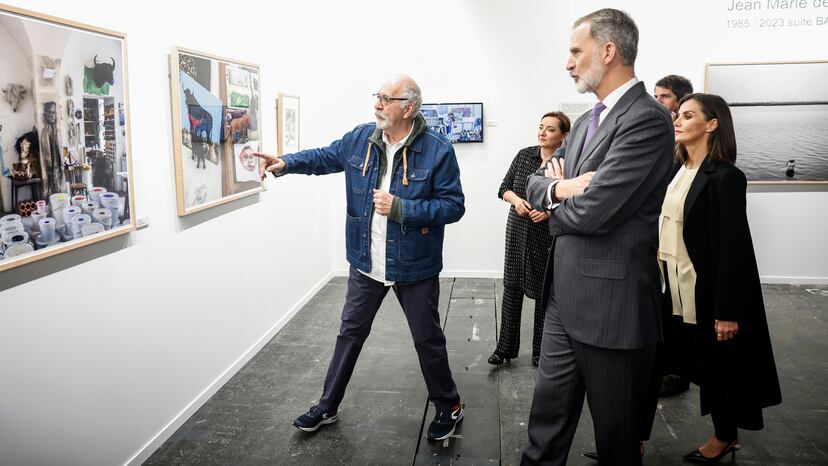 Se dice que los últimos serán los primeros, y el ultimo estand que visitaron los Reyes en su tradicional paseo inaugural de Arco fue el de EL PAÍS, dedicado este año a la obra fotográfica de Jean Marie del Moral en torno a la figura del pintor Miquel Barceló. Recibidos por la directora del periódico, Pepa Bueno, junto al presidente del Grupo Prisa, Joseph Oughourlian, y la vicepresidenta Pilar Gil, así como el presidente ejecutivo de Prisa Media, Carlos Núñez, don Felipe y doña Letizia dieron así por concluida su visita a una docena de galerías y espacios expositivos de la feria de arte contemporáneo madrileña, interesándose especialmente por los retratos de Barceló en los que se refleja el paso del tiempo sobre su rostro, así como por los contrastes de la luz en los diferentes estudios del pintor mallorquín. La Reina mostró con sus comentarios su conocimiento de la obra del fotógrafo francés, que además de Barceló ha inmortalizado a otros grandes nombres de la escena artística internacional, de Tàpies y Chillida a Motherwell y Lichtenstein.