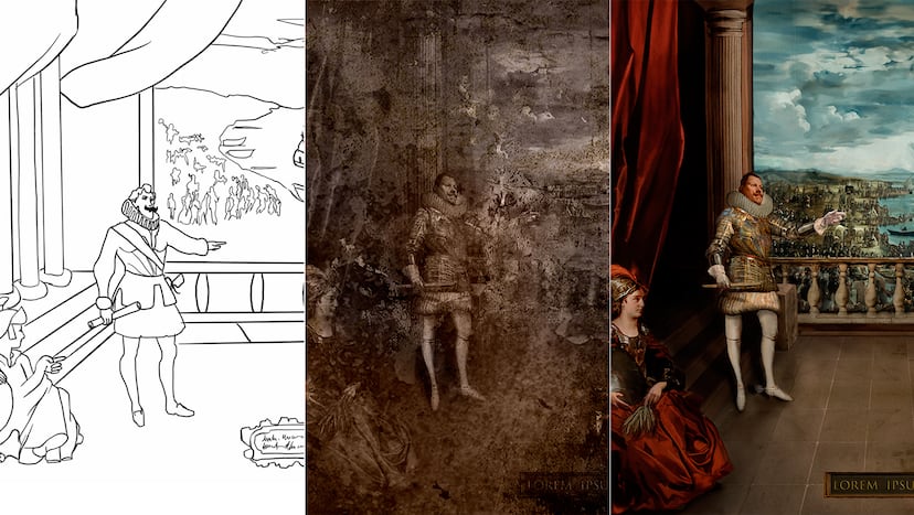 La IA contribuye, pero también se equivoca. Empezaron a trabajar con MidJourney, un sistema de inteligencia artificial que transforma palabras en imágenes y que funciona, por ejemplo, a través de la plataforma Discord. El sistema de comunicación, o sea, la voz que pregunta, se denomina prompt. Una instrucción —en forma de texto o imagen, que se proporciona a un modelo de lenguaje basado en IA— con el fin de generar respuestas coherentes. “Cuanta mayor precisión en el prompt, mejor funciona. Si redactas ideas genéricas referidas, en este caso, a nuestra pintura, del tipo ‘alegoría de España’, surgirán banderas españolas en la pantalla. Es un trabajo que exige mucho tiempo, paciencia, ir hacia adelante, regresar, consultar imágenes en internet, volver; avanzar”, asume Paula García, licenciada en Bellas Artes por la Complutense y especializada en diseño de videojuegos. “Los elementos más complejos han sido los escalones, las cortinas, las manos (una suya y otra del artista) de Felipe III y sobre todo la arquitectura”, comenta. Una vez recreados había que encajar las imágenes. Utilizaron la última versión del programa Adobe Photoshop porque incorpora inteligencia artificial. La opción se llama “relleno generativo” y permite unir diferentes imágenes sin que se aprecien las costuras. La ventaja de usar esta tecnología la sintetiza con otra imagen: “Es como contar con un ejército de becarios”.