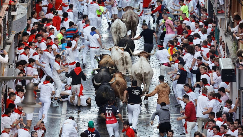 Al menos los toros, claro, porque los cabestros, sabiondos ellos, tomaron la cabeza de carrera y enfilaron la Cuesta de Santo Domingo a toda pastilla, como veteranos corredores de pasadas ediciones. Así, con varios bueyes por delante y la manada compacta, se abrieron paso entre los de blanco y rojo, y algunos corredores sufrieron los primeros atropellos por estar en el lugar equivocado y entorpecer el camino de los animales.