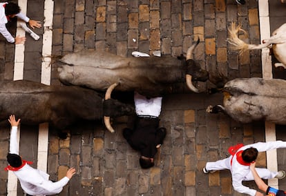 Varios corredores caen al suelo al paso de los toros de la ganadería de José Escolar, durante el séptimo encierro este sábado en Pamplona. Susana Vera (REUTERS)Llegada de los astados de José Escolar a la curva de Mercaderes, este sábado en Pamplona.